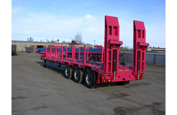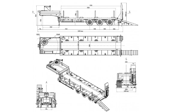 45000 кг, шины 445/65R22,5 или 395/85R20 / 6+1, платформа 10300 (11080 до трапов) x 2500 с уширителями до 3000 мм, механические трапы, ССУ 1510 мм, рессорная подвеска, съемные стойки 1500 мм