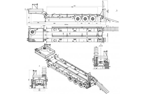 45000 кг, шины 445/65R22,5 или 395/85R20 / 6+1, платформа 10300 (11080 до трапов) x 2500 с уширителями до 3000 мм, механические трапы, ССУ 1510 мм, рессорная подвеска, съемные стойки 1500 мм