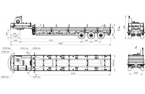 45000 кг, шины 395/85R20 или 445/65R22,5 / 6+1, платформа 10000 (10862 до трапов) x 2530 с уширителями до 3030 мм, ССУ 1532-1550 мм, рессорная или пневматическая подвеска, раздвижные коники