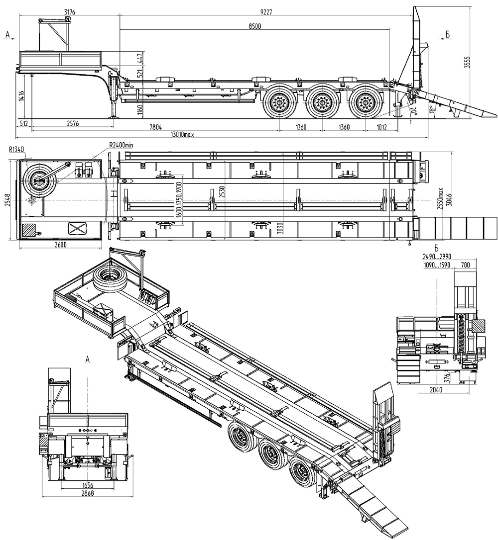 33500 кг, шины 385/65R22,5/6+1, платформа 8500 (9227 до трапов) x 2530 с уширителями до 3030 мм, ССУ 1510 мм, рессорная или пневматическая подвеска, съемные стойки