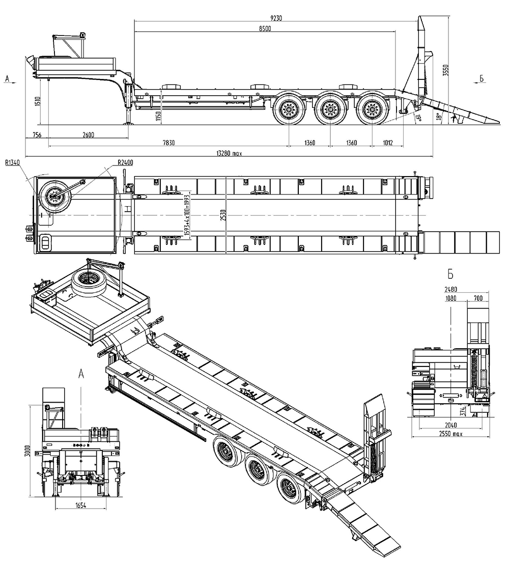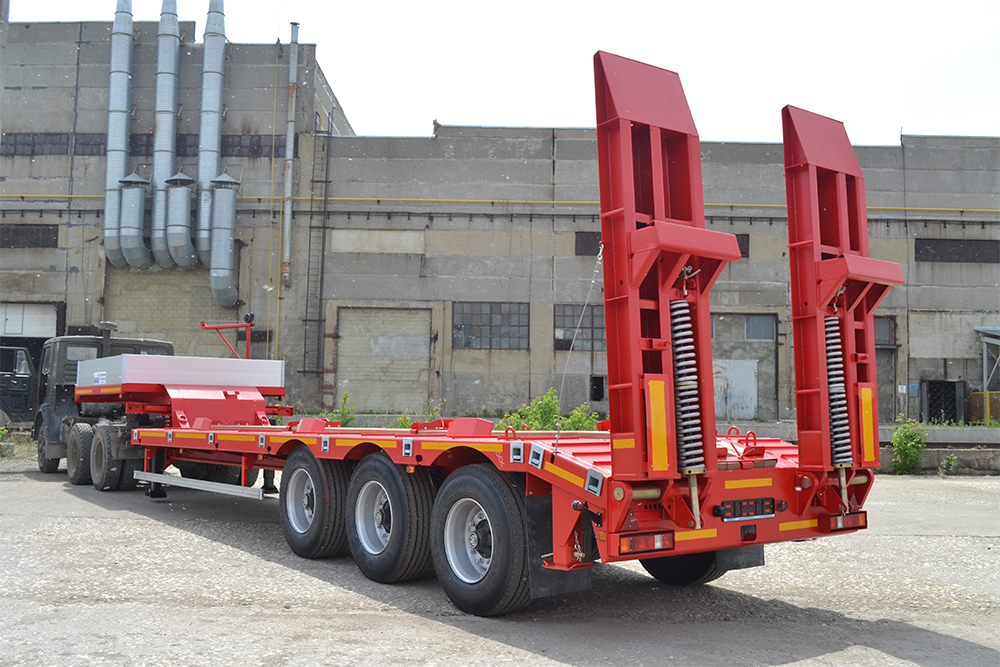 39000 кг, шины 385/65R22,5 или 445/65R22,5 / 6+1, платформа 11461 по трапам x 2500 с уширителями до 3000 мм, треугольные аппарели, ССУ 1430 мм, рессорная подвеска, съемные стойки или раздвижные коники 1500 мм, с бортами или без