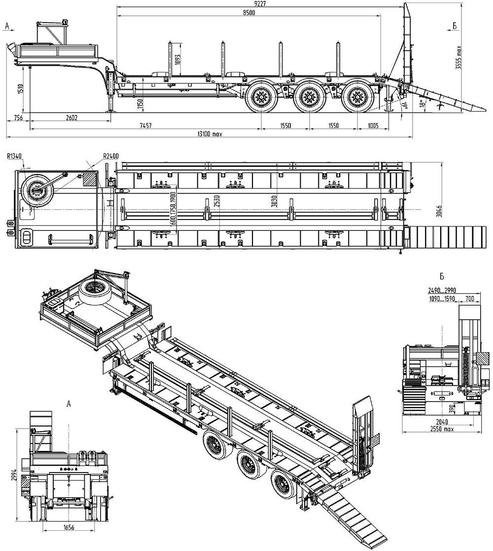29800 кг, шины 385/65R22,5/6+1, платформа 11474 (12200 до трапов) x 3000 мм, ССУ 1550 мм, рессорная или пневматическая подвеска, съемные стойки